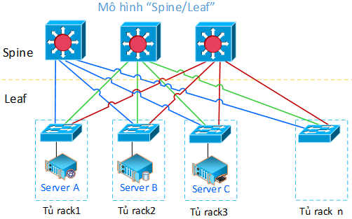 Mô hình này gồm có 2 tầng, các Switch mỗi tầng không nối với nhau. Chúng ta dễ dàng thấy rằng băng thông và độ trễ từ Server A đến Server B và Server C là như nhau. Hai Server bất kỳ nối với nhau đều đi qua một hop duy nhất. Để tăng băng thông Uplink thì chỉ cần thêm 1 Switch ở tầng Spine, việc thêm Switch ở tầng Leaf cũng đơn giản, hệ thống cáp cũng tường minh, dễ quản lý. Kiến trúc này còn được gọi là Layer 2 Fabric.