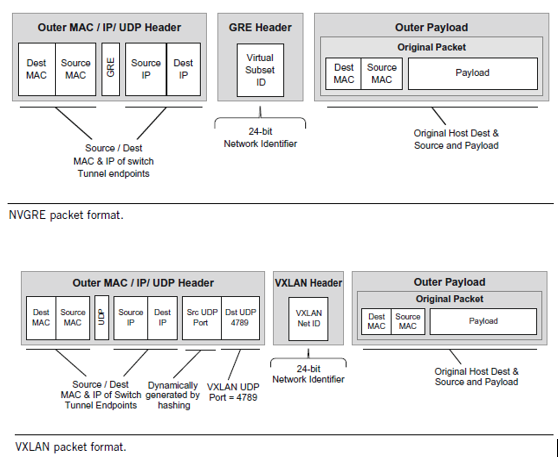 - Giao thức truyền tải (Transport protocol): NVGRE dùng giao thức Layer 3 GRE để đóng gói (encapsulation) các khung tin lớp 2 (Frame) và truyền đi trong mạng Layer 3. Trong khi đó đối với VXLAN thì khung tin lớp 2 được gán VXLAN header rồi đóng gói bằng giao thức UDP (Destination port 4678), sau đó được vận chuyển bằng giao thức IP nên còn được gọi là kỹ thuật MACin-UDP over IP.